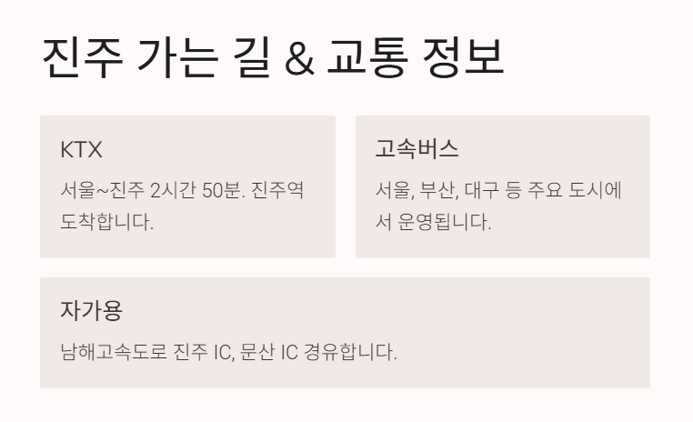 - KTX: 서울~진주 2시간 50분 (진주역 도착)