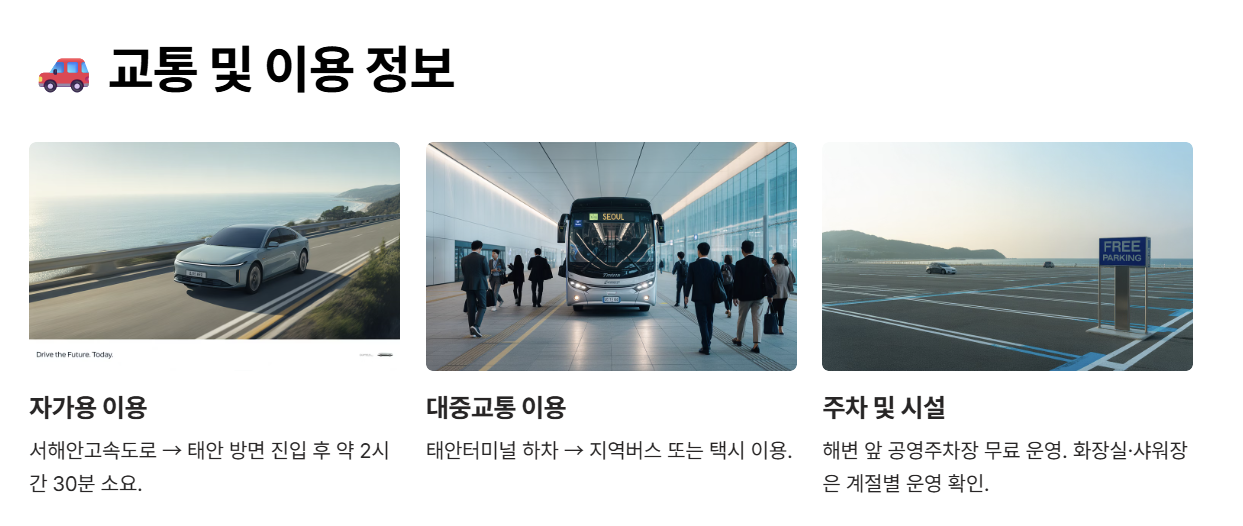 - 자가용: 서해안고속도로 → 태안 방면 진입 후 약 2시간 30분 소요