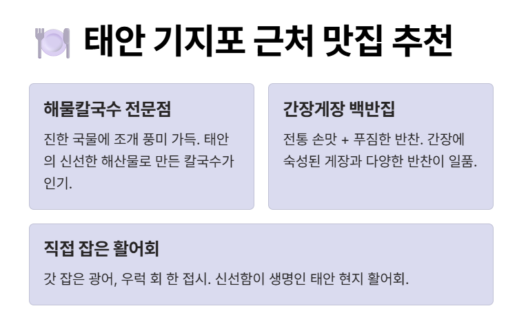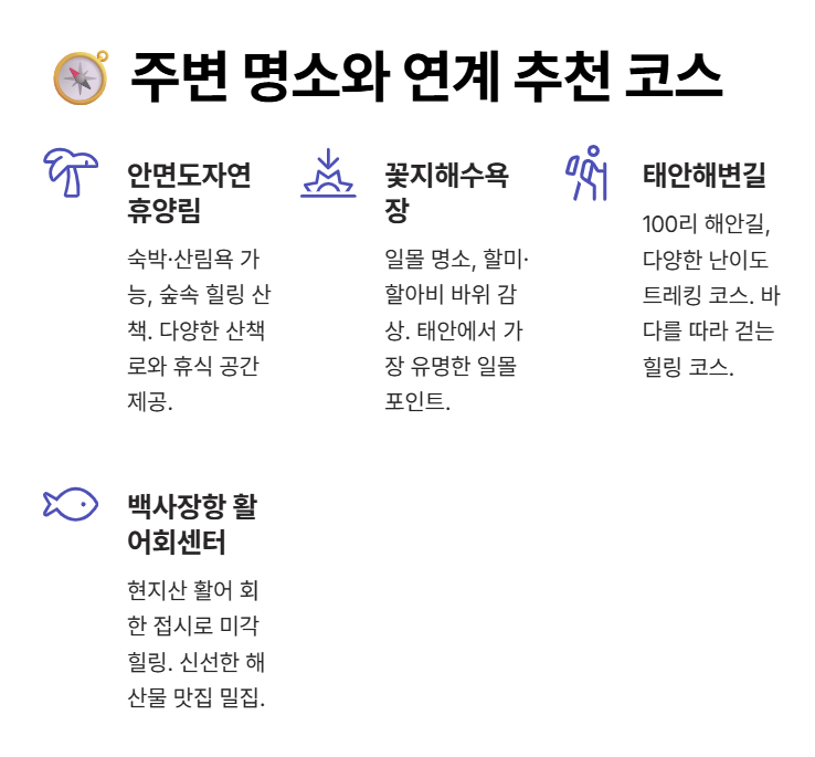 - 대중교통: 태안터미널 하차 → 지역버스 또는 택시 이용