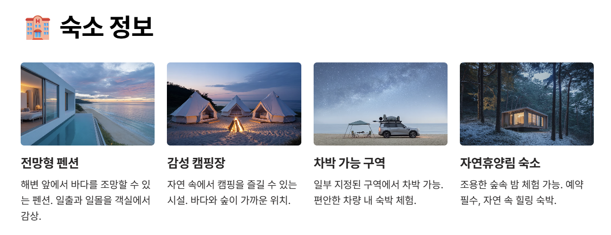 - 주차: 해변 앞 공영주차장 무료 운영 (성수기엔 조기 만차 주의)